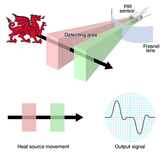 PIR sensors are more complicated than many of the other sensors explained in these tutorials (like photocells, FSRs and tilt switches) because there are multiple variables that affect the sensors input and output. To begin explaining how a basic sensor works, we'll use this rather nice diagram. The PIR sensor itself has two slots in it, each slot is made of a special material that is sensitive to IR. The lens used here is not really doing much and so we see that the two slots can 'see' out past some distance (basically the sensitivity of the sensor). When the sensor is idle, both slots detect the same amount of IR, the ambient amount radiated from the room or walls or outdoors. When a warm body like a human or animal passes by, it first intercepts one half of the PIR sensor, which causes a positive differential change between the two halves. When the warm body leaves the sensing area, the reverse happens, whereby the sensor generates a negative differential change. These change pulses are what is detected.